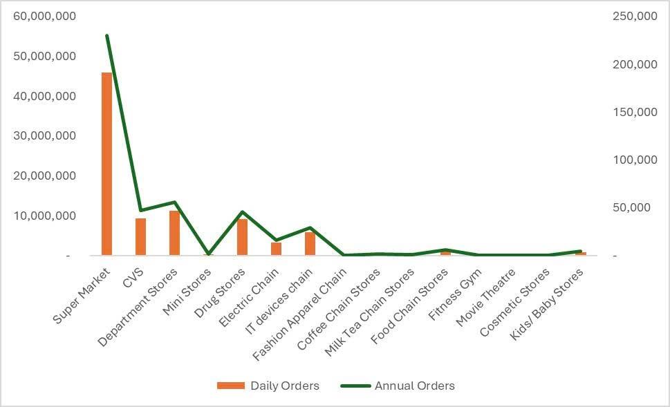 Theo dữ liệu tổng hợp từ biểu đồ Modern Retail Orders 2021, phản ánh tổng số đơn hàng hàng năm và trung bình đơn mỗi ngày của 15 kênh bán lẻ hiện đại, siêu thị vẫn là kênh dẫn đầu về quy mô giao dịch. Tổng số đơn hàng tại kênh này đạt gần 45 triệu đơn mỗi năm, tương đương hơn 190.000 đơn/ngày. Với lợi thế danh mục hàng hóa phong phú và mức giá cạnh tranh, siêu thị tiếp tục là lựa chọn ưu tiên cho các lần mua sắm tập trung, đặc biệt đối với hàng tiêu dùng nhanh và hàng thiết yếu.